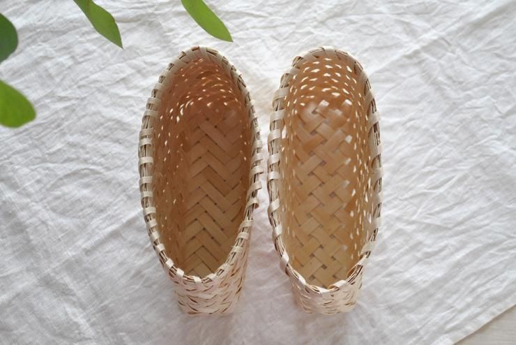 樹齢20〜30年のイタヤカエデの若木の幹を、厚さや幅を揃えて帯状に裂いて材料をつくり、それを編んでいく工程は気の遠くなるような手作業です。