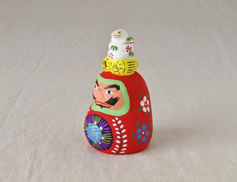 眼力の強い達磨の上に、米俵と松竹梅柄の白蛇が乗ったユーモラスな人形。