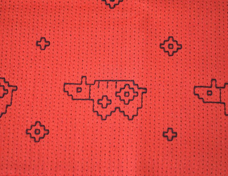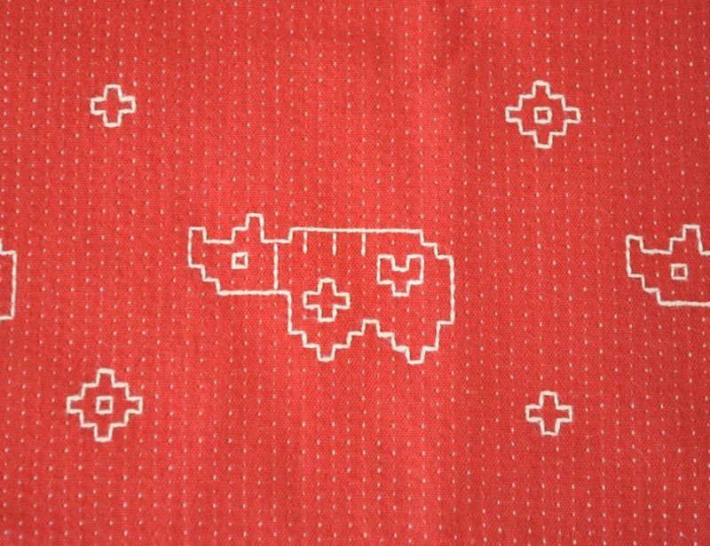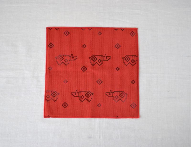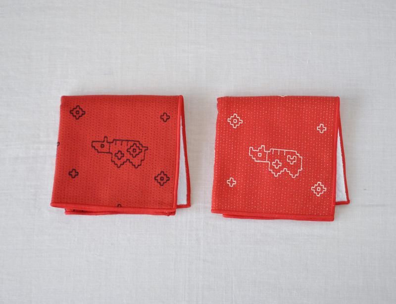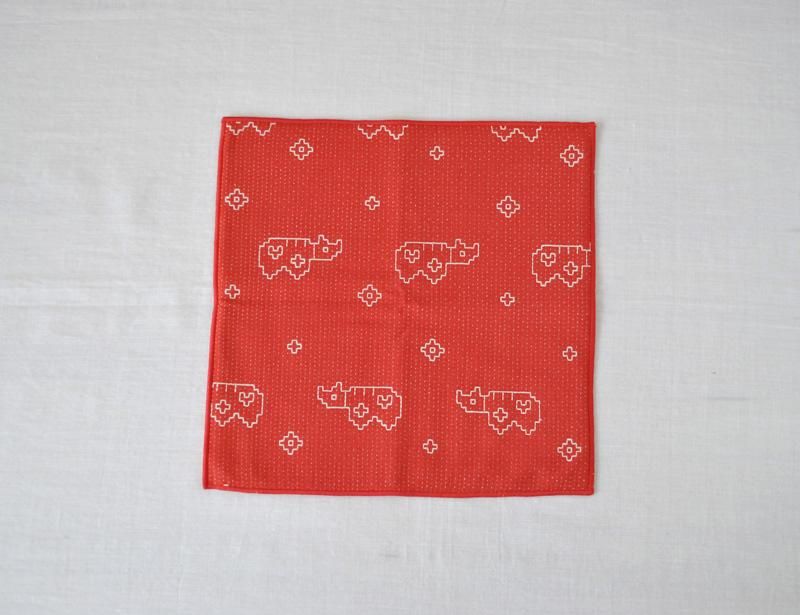 刺し子織りに、会津ならではの可愛らしい赤べこ柄が加わりました。発色の良い赤はとても縁起の良い色。力強い赤べこと厄除けを表現しています。