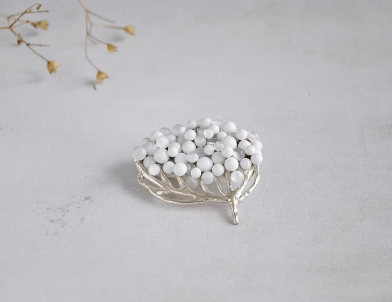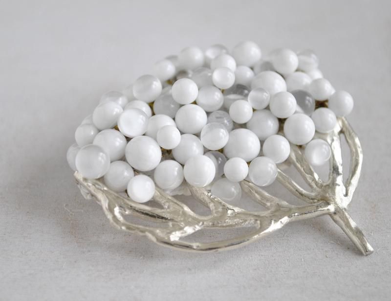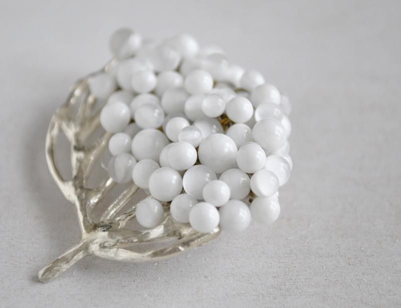 真っ白なガラスと透明ガラスを絶妙なバランスで組み、たわわな姿を表現した贅沢でボリュームのあるブローチに仕上がっています。