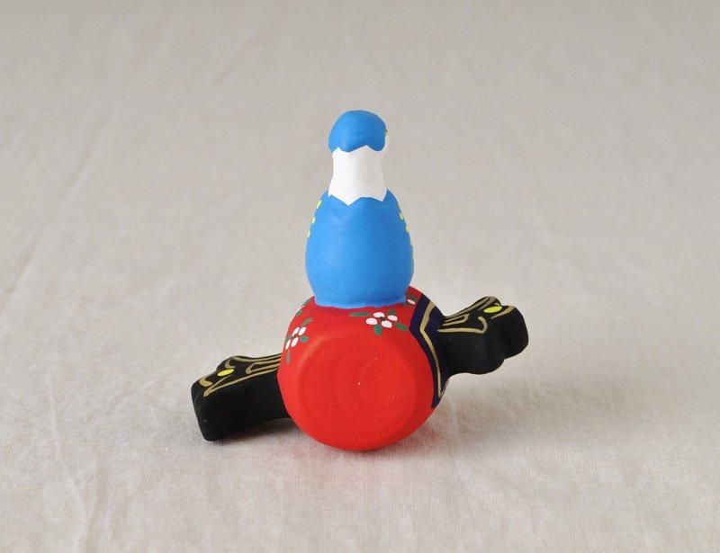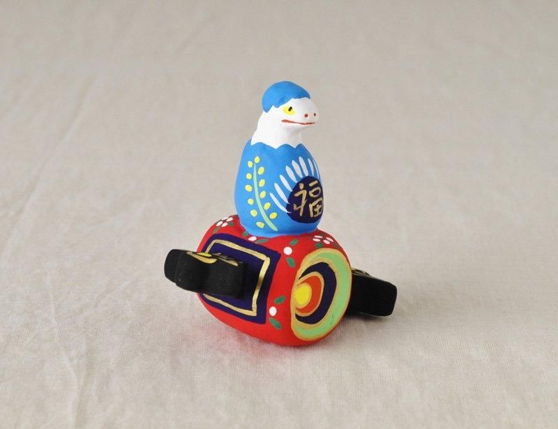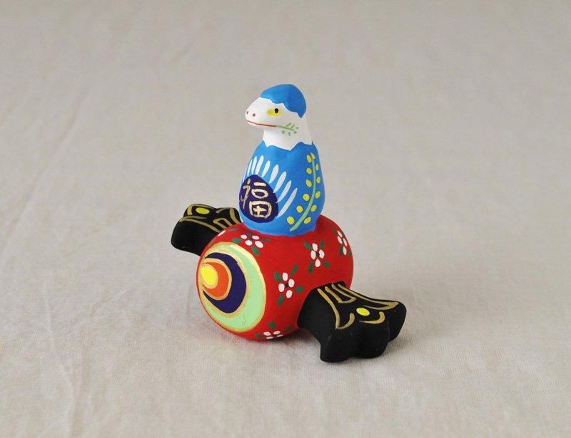 真っ赤な小槌の上に、卵を割ってひょっこり顔を出した白蛇が乗ったユーモラスな人形。