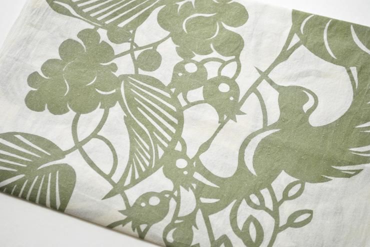 ダイナミックに花と鳥を配置し型染めした美しい染布です。