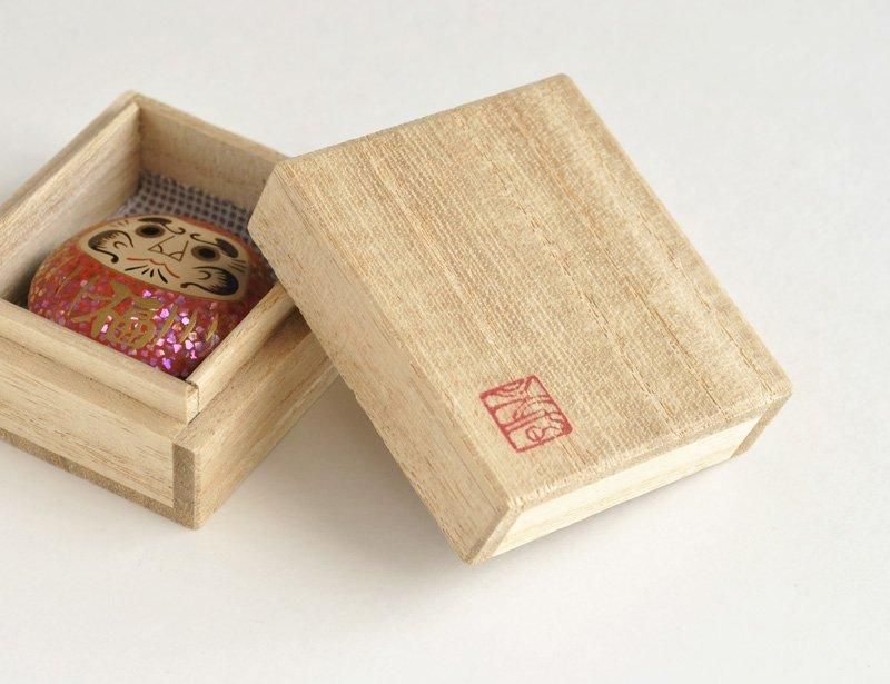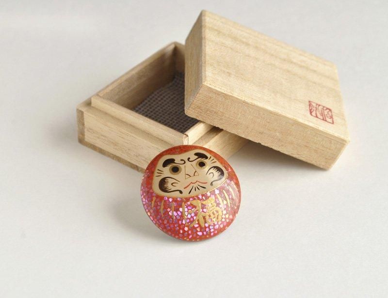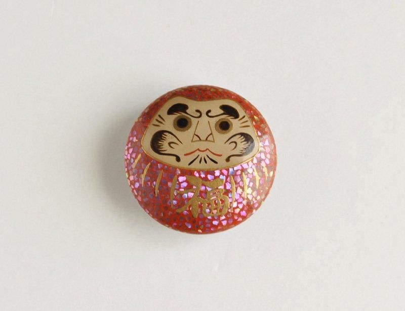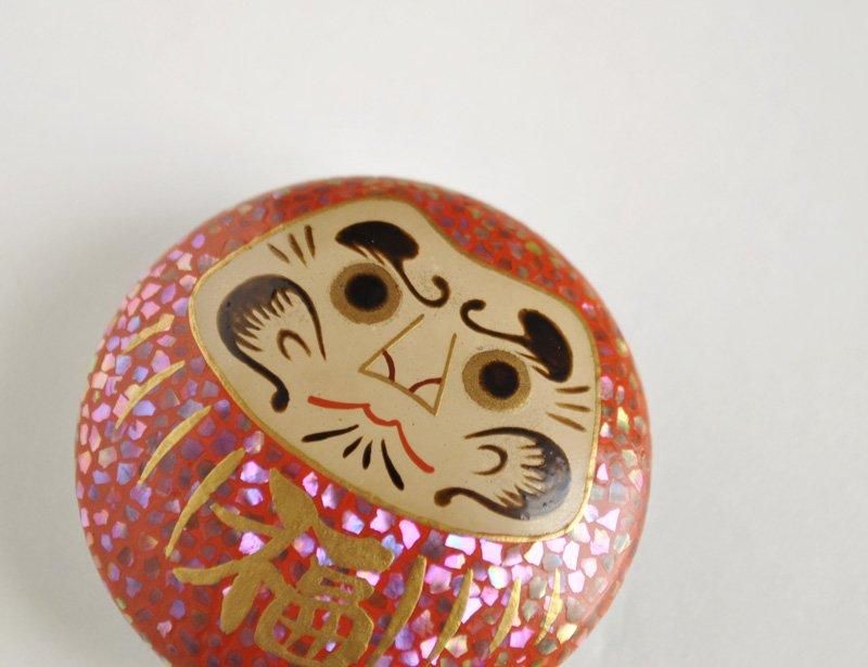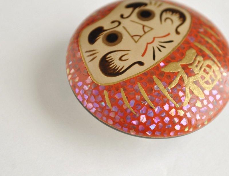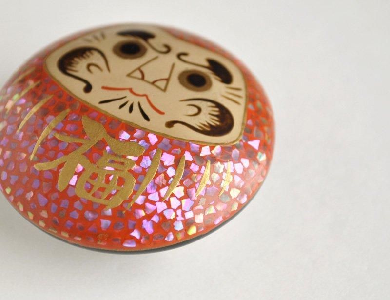 きりりと頼もしくどこか愛らしさの残る表情のだるまさん。贅沢に煌めく螺鈿と大きな金の福文字が、様々な災厄から守ってくれそうですね。
