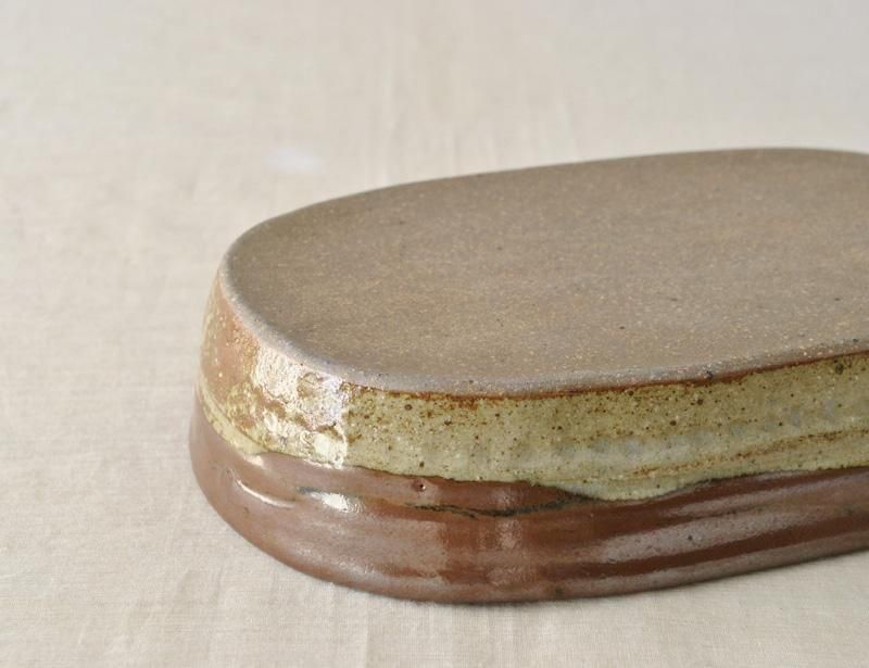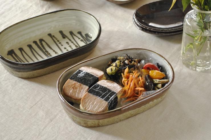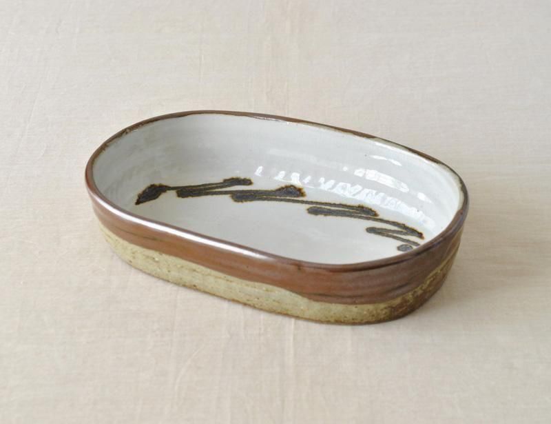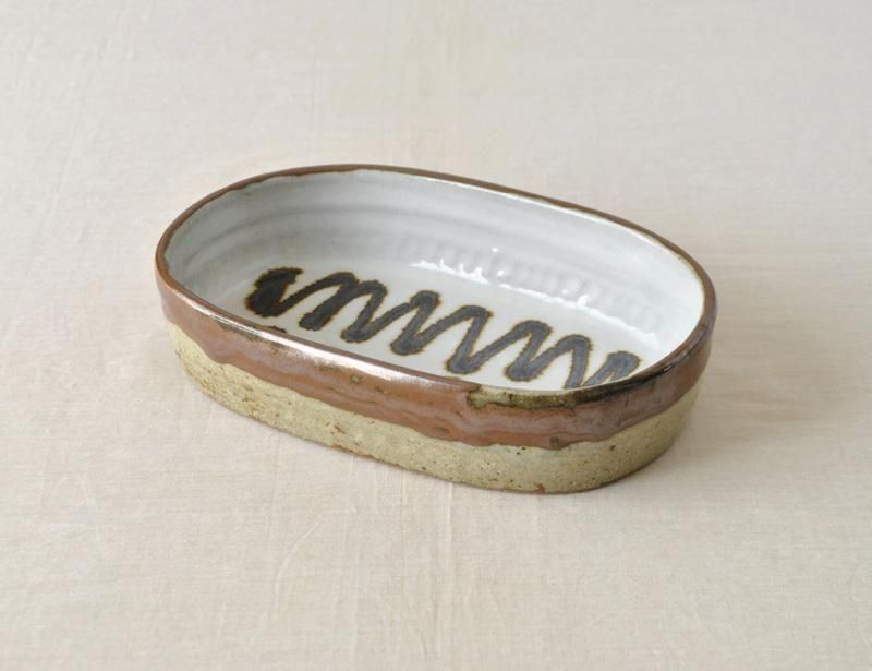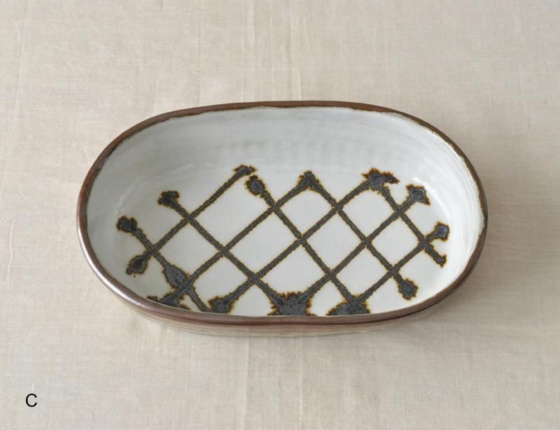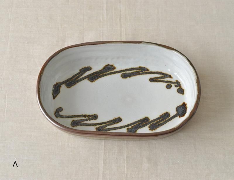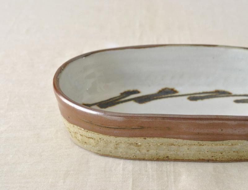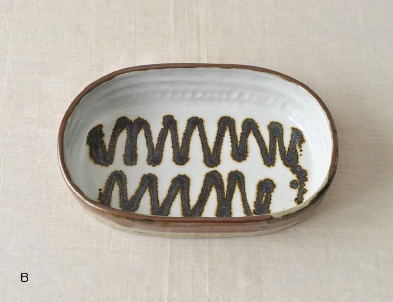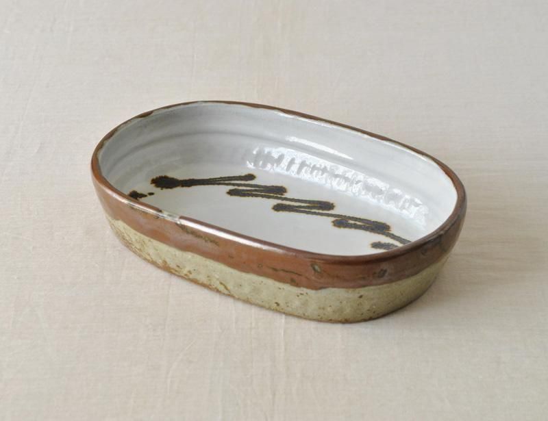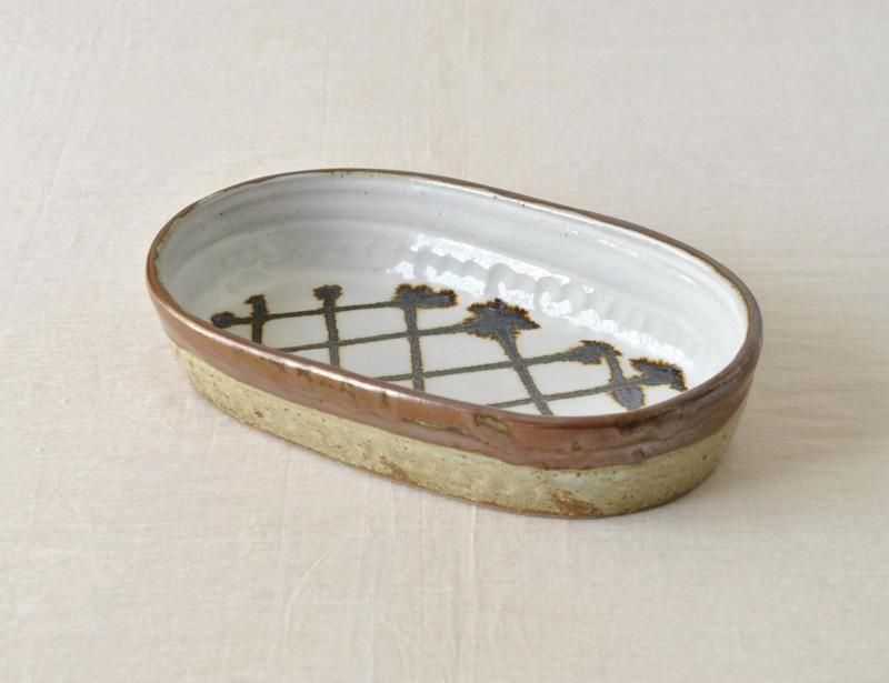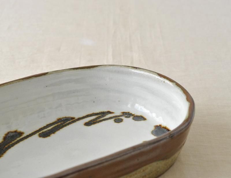 鉄釉による大胆な絵柄がモダンなオーバル型グラタン皿。